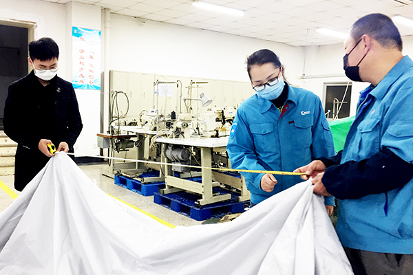 ​在保持防护服生产的情况下,公司其它业务板块人员已全部复工复产。在环保科技公司缝制车间里,100多名职工正在加班赶制华电水泥、中电投等公司的环保滤袋订单,将按照要求在本月20日前完成交付。在装具车间,200多职工正忙于即将交付的军品帐篷生产任务,质量检验人员对每件产品进行验收合格后才允许出厂。