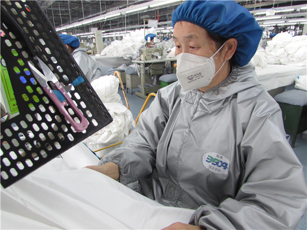 张新华是缝纫车间一名普通的女职工,在此次防护服生产中负责粘胶条,这是一道十分重要且耗时的工序,关乎防护服的密闭性,需要手脚与机器的高度配合,温度低了粘合不上,温度高了衣服容易烫坏,一天下来累的浑身疼,腿部尤其疼痛。但为了不耽误生产,虽已年过五十的她,没有丝毫退缩,主动加班到半夜12点,日产量为小组最高。当她拖着疲惫的身体躺在床上时,已经是凌晨2点。清晨的6点,张新华已经坐上班车,即将开始新一天的工作。她说:“虽然这段时间很辛苦,每天睡眠时间只有3小时,但是一想到抗疫前线的战斗英雄们,我就希望自己能再快点,再多干些”。
