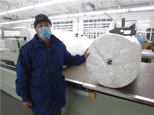 肖春泽说:“来的材料轻的也有300斤重,我们装卸队24小时待命,防护服材料什么时候到,我们就什么时候在,虽然这份工作很辛苦,但是我们装卸队知道,这都是制作防护服用的,是要送到前线去的,这很有意义,大家都跟我一样充满了干劲”。