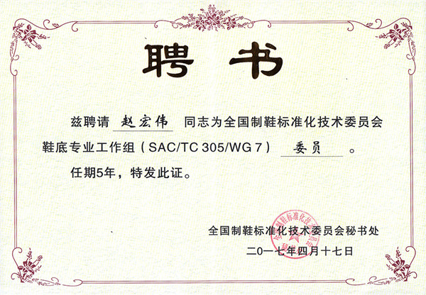 公司技术总监赵宏伟凭借深厚的理论功底、扎实的专业知识和丰富的实践经验,受聘为全国制鞋标准化技术委员会委员,荣膺这一殊荣实至名归。